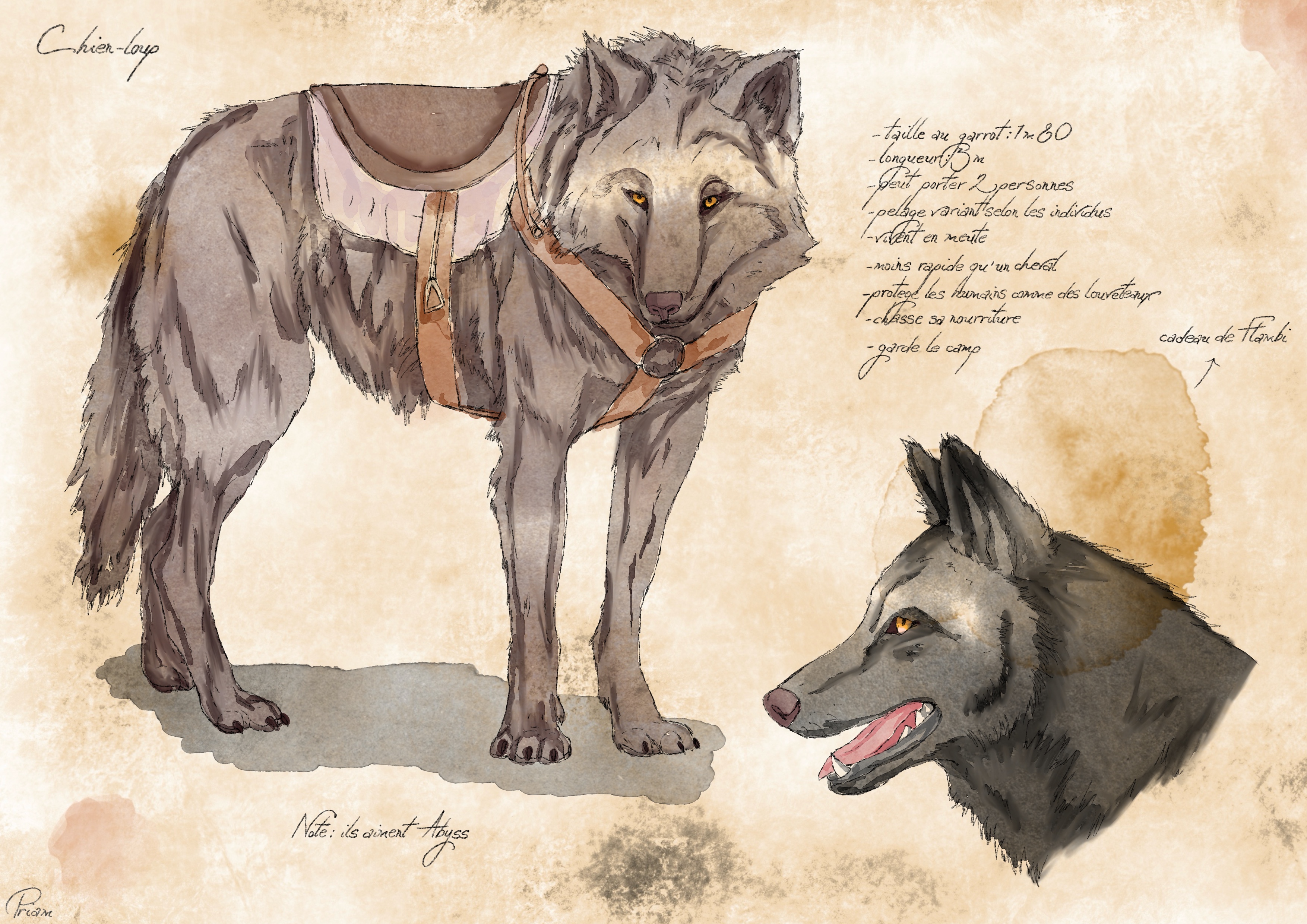 Le but n’est pas de faire un dessin réaliste, mais un dessin qui s’ancre dans l’histoire. Cette créature se trouve donc dans les notes de voyage de Priam, l’un des personnages. Tout, du papier au croquis et la coloration, a été réalisé par mes petites mains. C’est un aspect volontairement brouillon, avec un dessin dont on voit les coups de crayon pour l’aspect « carnet de voyage ». Ça me change totalement de mon style, mais c’est agréable d’une fois utiliser mes brushes d’aquarelle qui jusque-là ne m’avaient pas beaucoup servi !
