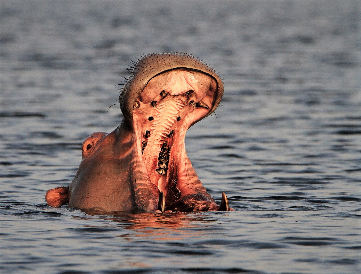 Il ne baille pas parce qu'il a sommeil, il montre le matériel pour expliquer qu'il ne faut pas aller plus loin. Avertissement pris très au sérieux lorsque l'on sait que les hippopotames sont les animaux qui provoquent le plus grands nombre d'accidents.