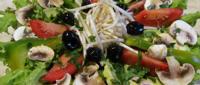 - Disposer les légumes et les champignons sur la salade. Ajouter les pousses de soja, les olives et la coriandre ciselée.