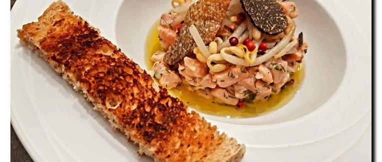 - Mettez le poisson dans un récipient et ajoutez les huiles,l'échalote, le jus de citron, l'aneth,la truffe hachée, du sel et du poivre.
