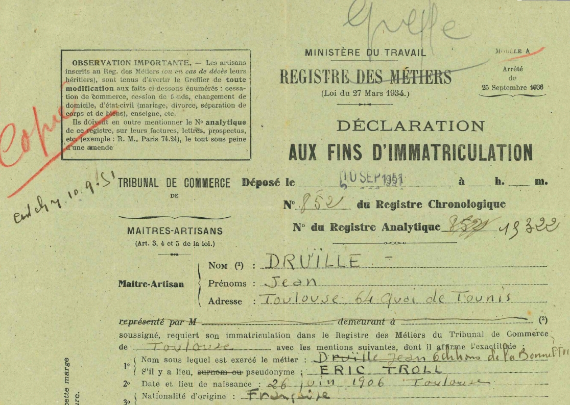 J’ai trouvé qu’en septembre 1951, il avait créé une société « Editions de la bonne étoile » inscrite à la Chambre des Métiers de Toulouse. Dans le dossier d’inscription, il est stipulé que le pseudonyme sera Eric Troll. Cette « entreprise » n’a duré que quelques mois. Mais ce pseudonyme n’était pas une lubie.
