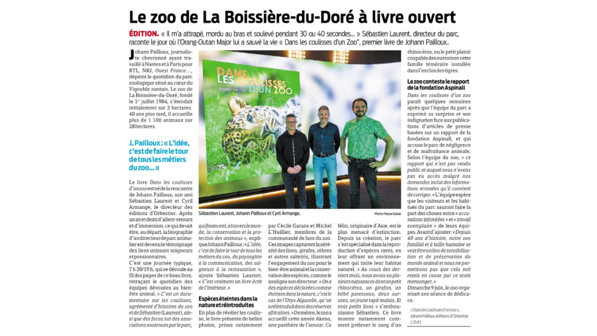 Le dimanche 9 juin, le zoo de la Boissière du Doré organise une séance de dédicace pour le livre “Dans les coulisses d’un zoo”. L’auteur Johann Pailloux et le directeur Sébastien Laurent seront présents. Les sessions de dédicaces auront lieu de 11 h à 12 h et de 17 h à 19 h près du pôle restauration. Le livre est disponible à l’achat pour 25 €.