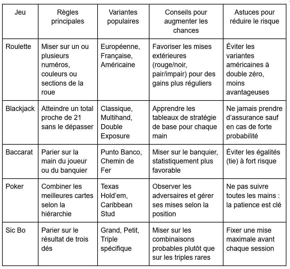 Les Jeux de casino proposés sur 1win, tels que la roulette, le blackjack ou le baccarat, disposent chacun de leurs spécificités. Savoir quand miser, quand s’arrêter et quelle variante choisir fait souvent la différence entre un joueur occasionnel et un connaisseur averti. Le tableau ci-dessous présente un aperçu des principales pratiques et conseils à suivre pour maîtriser les classiques du casino :