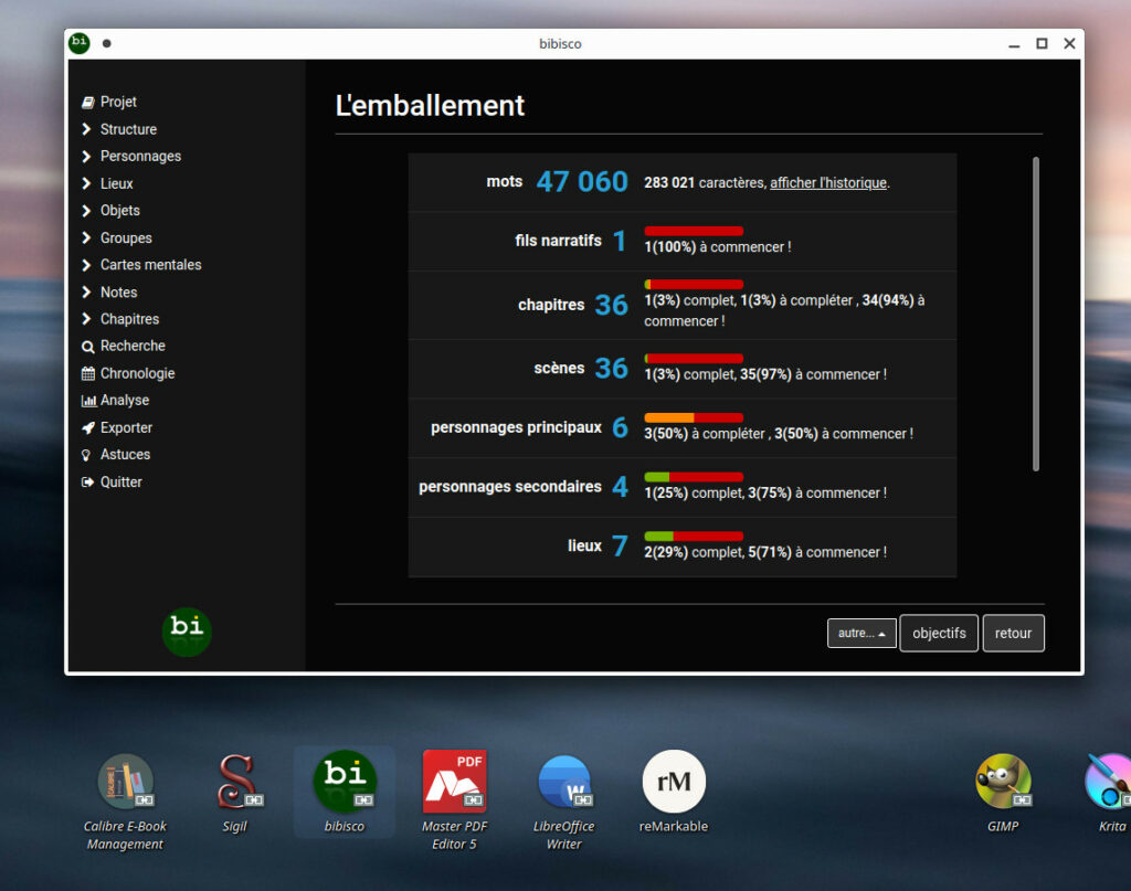 Pour centraliser toutes ces actions, j’utilise Bibisco, un logiciel libre d’aide à l’écriture dans la veine de Manuskript, Scrivener ou Story Architect. Je l’aime beaucoup, car il est très intuitif. À noter que le concepteur espagnol est très réactif. Il a répondu dans la journée, de manière complète et agréable, à une simple question par mail. Bibisco permet l’exportation directe en PDF ou en epub.