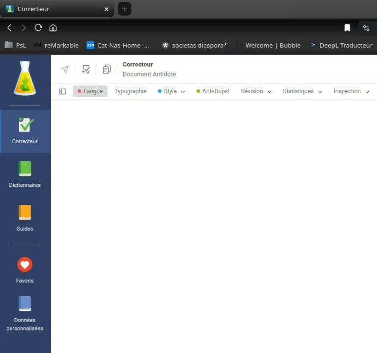 J’en arrive au correcteur orthographique, grammatical et stylistique. Antidote, connu par les auteurs comme Barabbas à la passion. J’y copie-colle mes chapitres avant de les introduire dans Bibisco et j’effectue la relecture-correction en ligne. Il est extrêmement performant, son IA de réécriture de certains passages est impressionnante, mais il ne faut pas lui faire en tous points confiance, la refonte modifie parfois à l’extrême le sens initial de la phrase concernée. L’IA doit rester un outil à utiliser avec des pincettes. Pourquoi ne pas l’intégrer directement au traitement de texte plutôt que LanguageTool ? Druide, la société à l’origine d’Antidote, a choisi de ne pas adapter ce logiciel pour les systèmes d’exploitation Linux, une décision regrettable.