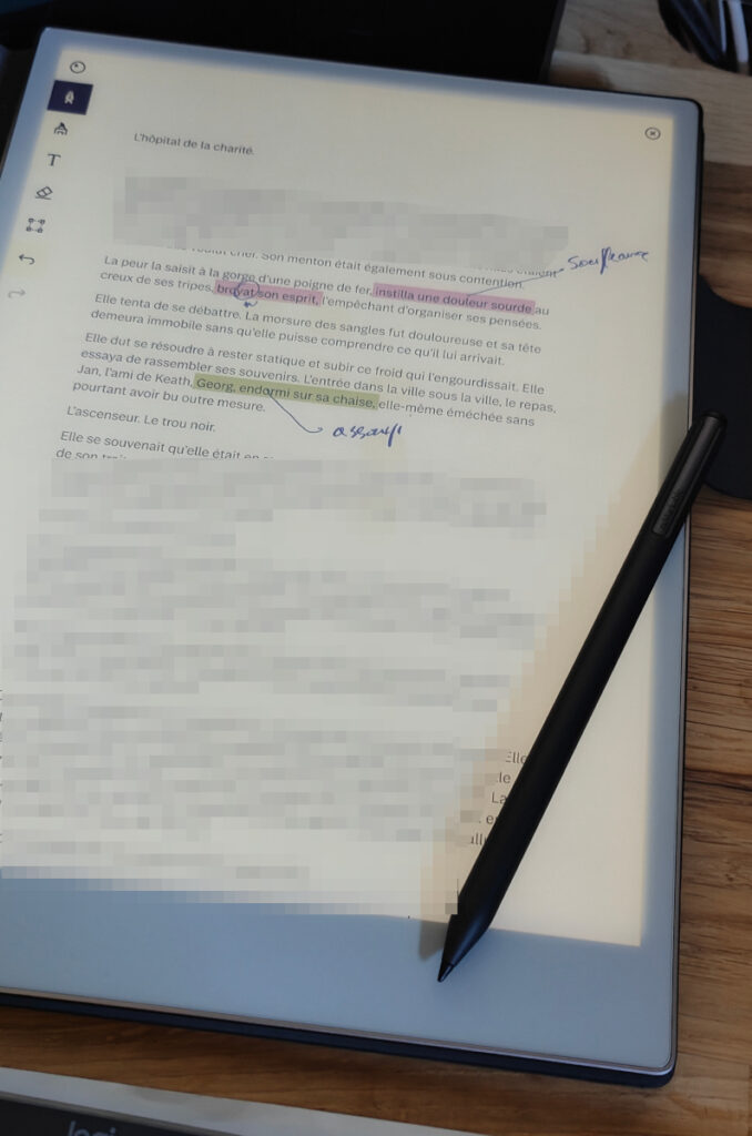 Bien sûr, elle est plus imposante en poids et par ses dimensions, ce qui ne la rend pas commode pour un rôle unique de lecture. Toutefois, la prise de notes est si intuitive, j’ai l’impression d’écrire sur une feuille de papier. Munie d’un clavier, elle me permet aussi, à ma convenance, la dactylographie sans la nécessité d’employer le stylet. L’encre électronique est colorée et me permet de souligner et d’annoter mon premier jet sans effort.