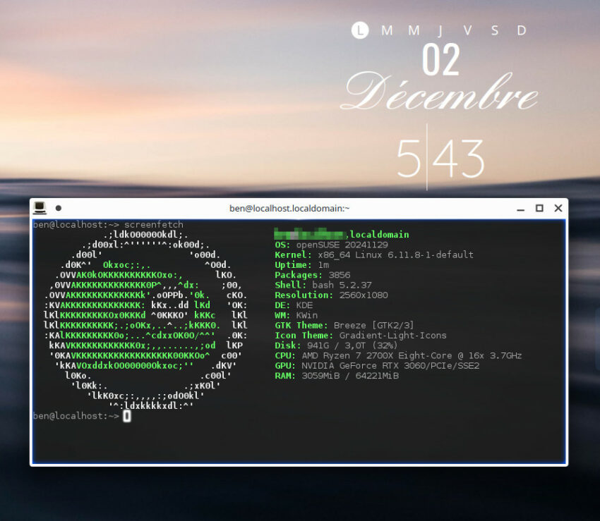 L’ordinateur n’est pas récent, il doit avoir quatre ou cinq ans, mais depuis longtemps, j’achète les pièces constituantes de mes machines séparément et je « monte » mon PC personnellement. Je suis ainsi certain de la qualité des composants, de la compatibilité système et, surtout, je m’assure une longévité importante par rapport à l’obsolescence programmée. Je tourne donc sous Opensuse Tumbleweed KDE.