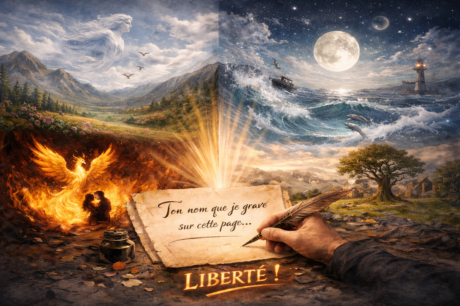 Les quatre éléments (le vent, l'océan, le feu, la terre) et la Liberté. Une main écrit sur un parchemin à l'aide d'une plume : "Ton nom que je grave sur cette page".