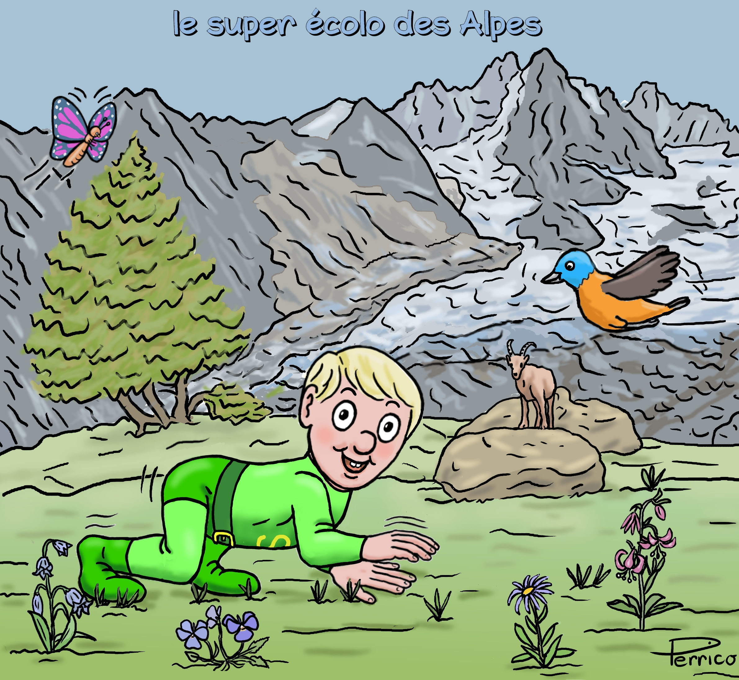 Voici un test pour voir si, vous aussi, vous êtes un super écolo des Alpes. Pour celà, vous devez désigner sur le dessin les plantes suivantes : le lys martagon, la campanule, l'aster des Alpes, la pensée des Alpes, l'arolle ou arole ou pin cembro. Sinon, vous avez sans doute repéré le bouqurtin perché sur un bloc erratique (c'est quoi ça ... ? ). En ce qui concerne l'oiseau, à vous de trouver son nom !