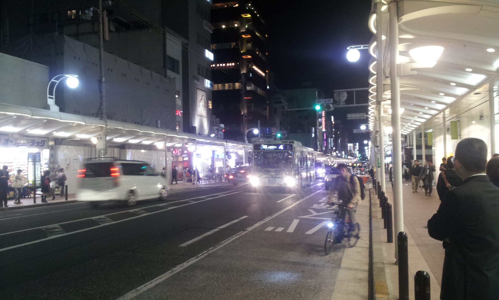 En sortant de la galerie commerciale, je trouve directement le bon bus. Par hasard. Un jeune Japonais me confirme que c'est le bon arrêt. Il fait nuit. Les Japonais vivent à l'heure solaire, il faut s'y habituer. L'animation continue probablement la nuit, mais sans moi.