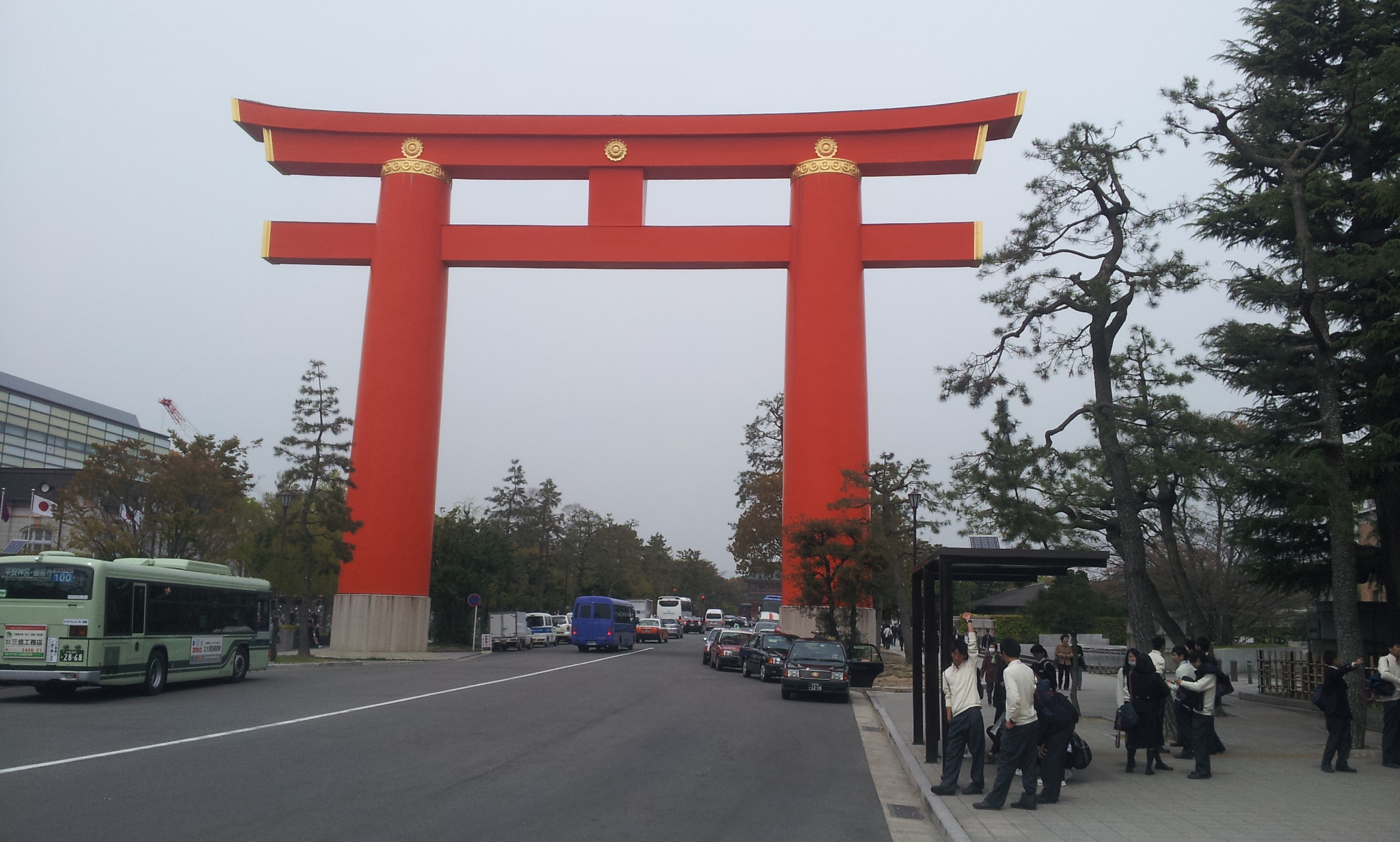 Ensuite, je longe un canal où navigue un petit bateau puis secteur d'Okasaki parc. On voit le zoo de l'autre côté du canal. Zèbres, girafes et flamants roses. En venant du sud, entre les deux musées d'art, on passe sous un immense torii rouge.