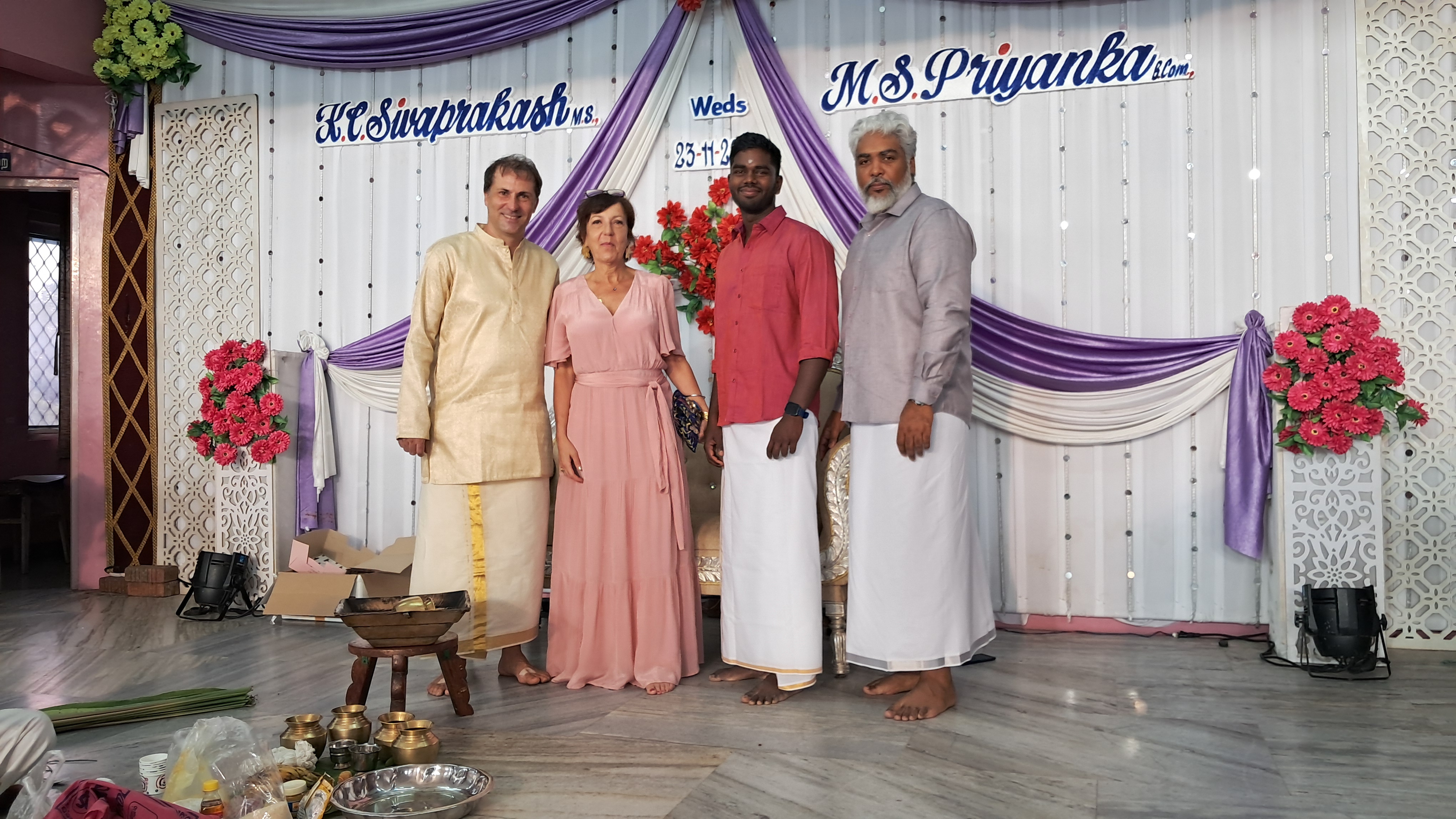 Tout ce petit monde s'est côtoyé à Toulouse depuis une dizaine d'années, ma tante et ses amis ayant participé à accueillir et soutenir ces jeunes indiens, débarquant alors du lycée français de Pondichéry pour venir étudier en France. Des amitiés se sont soudées, les chemins se sont depuis personnalisés, mais Siva a pour sa part trouvé du travail à Toulouse dans l'industrie automobile en tant qu'ingénieur, et convie toutes ces amitiés toulousaines fortes à son mariage ici à Madurai.... moi compris, ma tante lui ayant régulièrement parlé de moi.