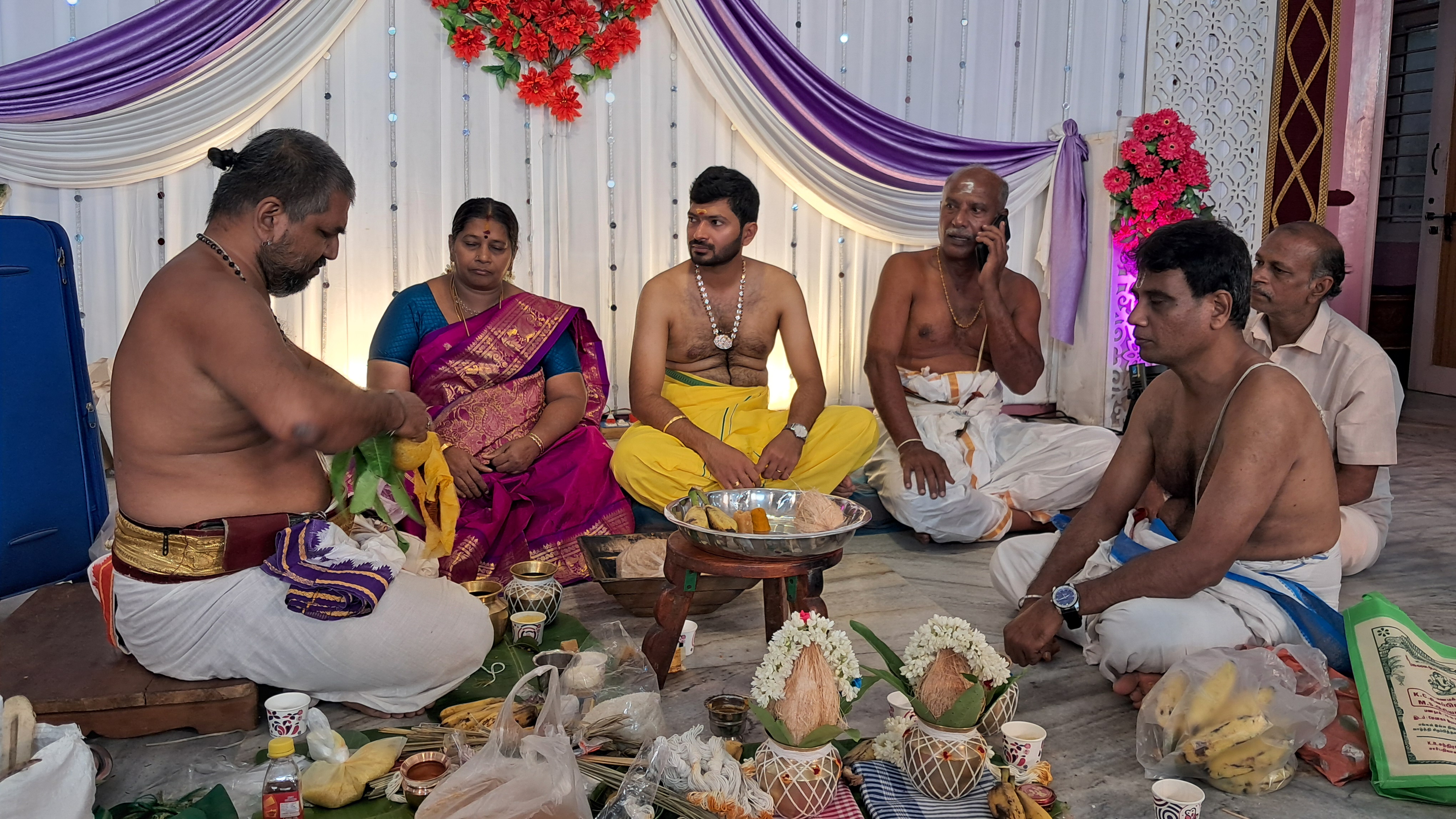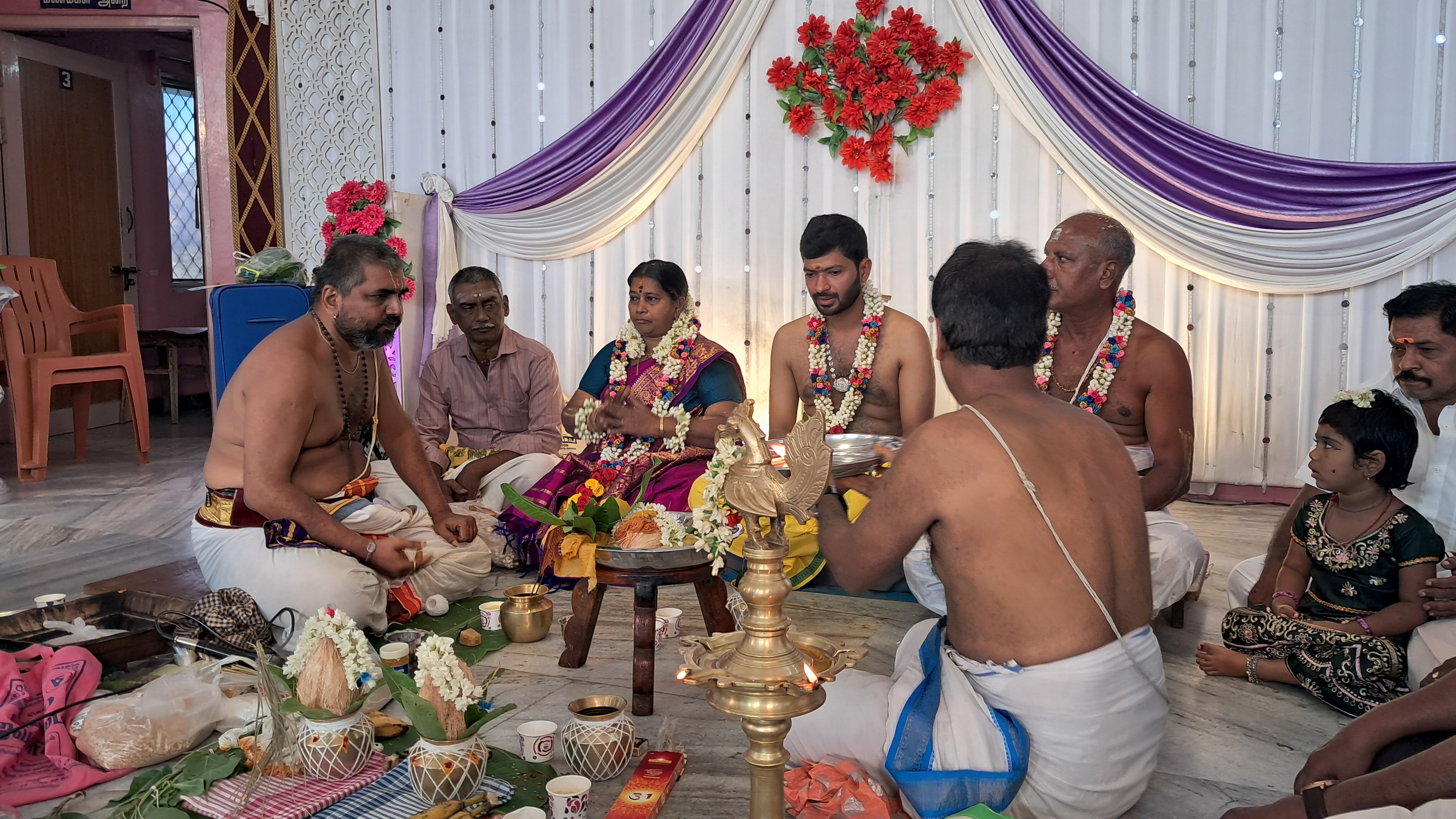 La cérémonie est officiée par un prêtre et son assistant, qui dispose devant lui un certain nombre d'éléments qui vont participer du rituel : du riz, des noix de cocos, des pots d'eau et de lait, des fleurs, des colliers et bracelets de jasmin, des poudres colorées, des morceaux de bois et notamment de bois de santal, des plateaux argentés, des bougies et des lampes à huile....