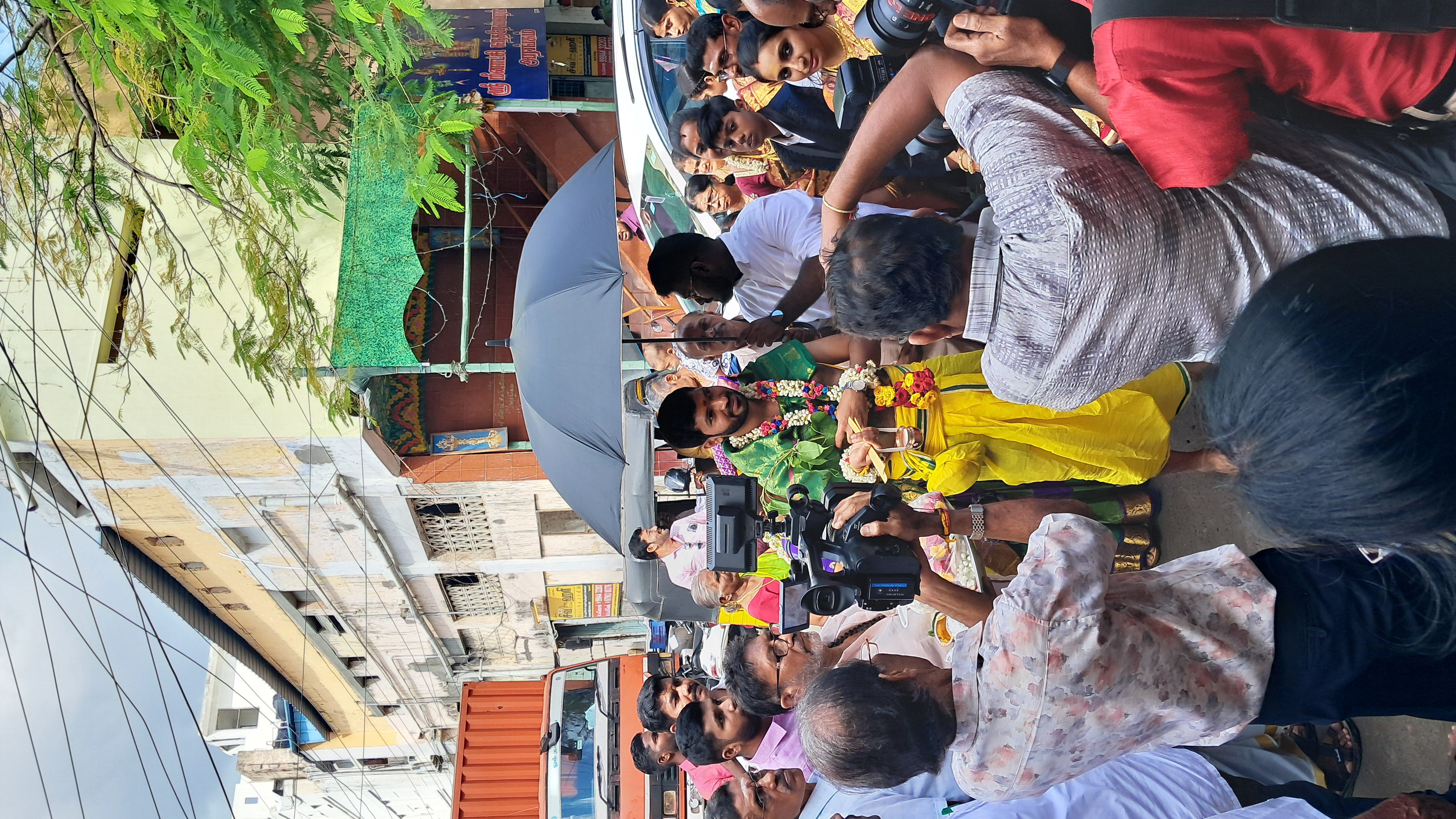 La cérémonie terminée, alors nous pouvons accompagner le marié à pied de son mahal jusqu'à celui de sa future épouse, où l'ensemble de son entourage nous attend. Siva prend alors place sur l'estrade, où viennent ensuite s'associer de nombreuses personnes pour l'entourer.