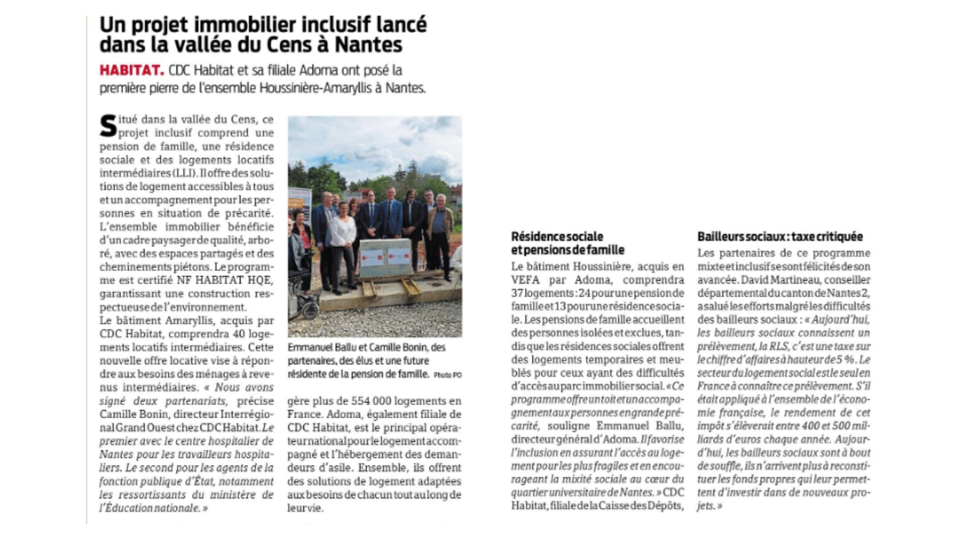 Le groupe CDC Habitat et sa filiale Adoma ont posé la première pierre de l’ensemble immobilier Houssinière - Amaryllis à Nantes, le 11 septembre, dans le secteur universitaire Petit Port. Les travaux, réalisés par Bouygues Immobilier, devraient être achevés au deuxième trimestre 2026.