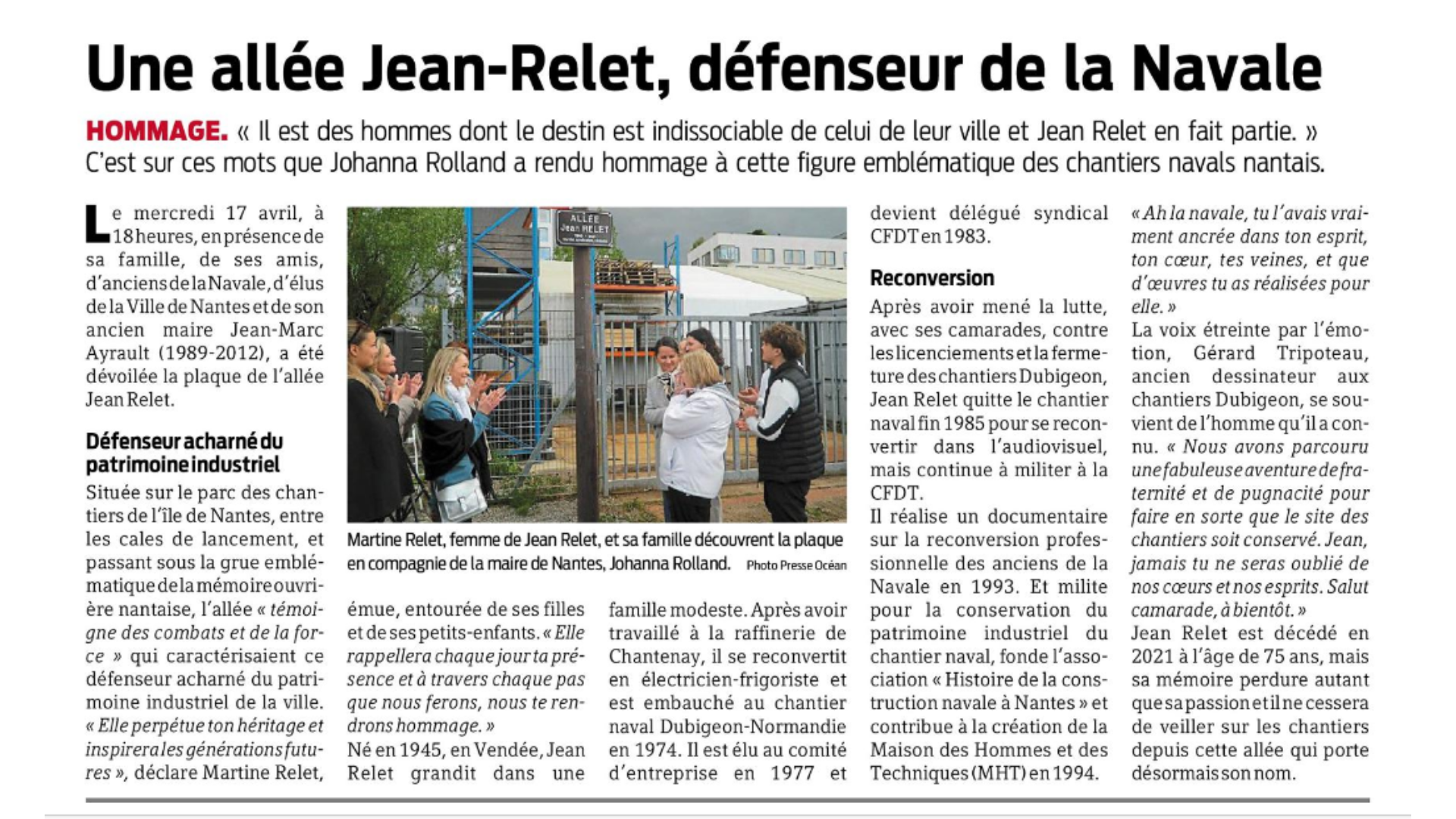 Ce mercredi, à 18 h, en présence de sa famille, de ses amis, d’anciens de la Navale, d’élus de la ville et de Jean Marc Ayrault, fut dévoilée la plaque de l’allée Jean Relet. Située sur le parc des chantiers de l’île de Nantes, entre les cales de lancement, et passant sous la grue emblématique de la mémoire ouvrière nantaise, l’allée « témoigne des combats et de la force » qui caractérisaient ce défenseur acharné du patrimoine industriel de la ville. « Elle perpétue ton héritage et inspirera les générations futures. » déclare Martine Relet, émue, entourée de ses filles et de ses petits-enfants. « Elle rappellera chaque jour ta présence et à travers chaque pas que nous ferons, nous te rendrons hommage. »