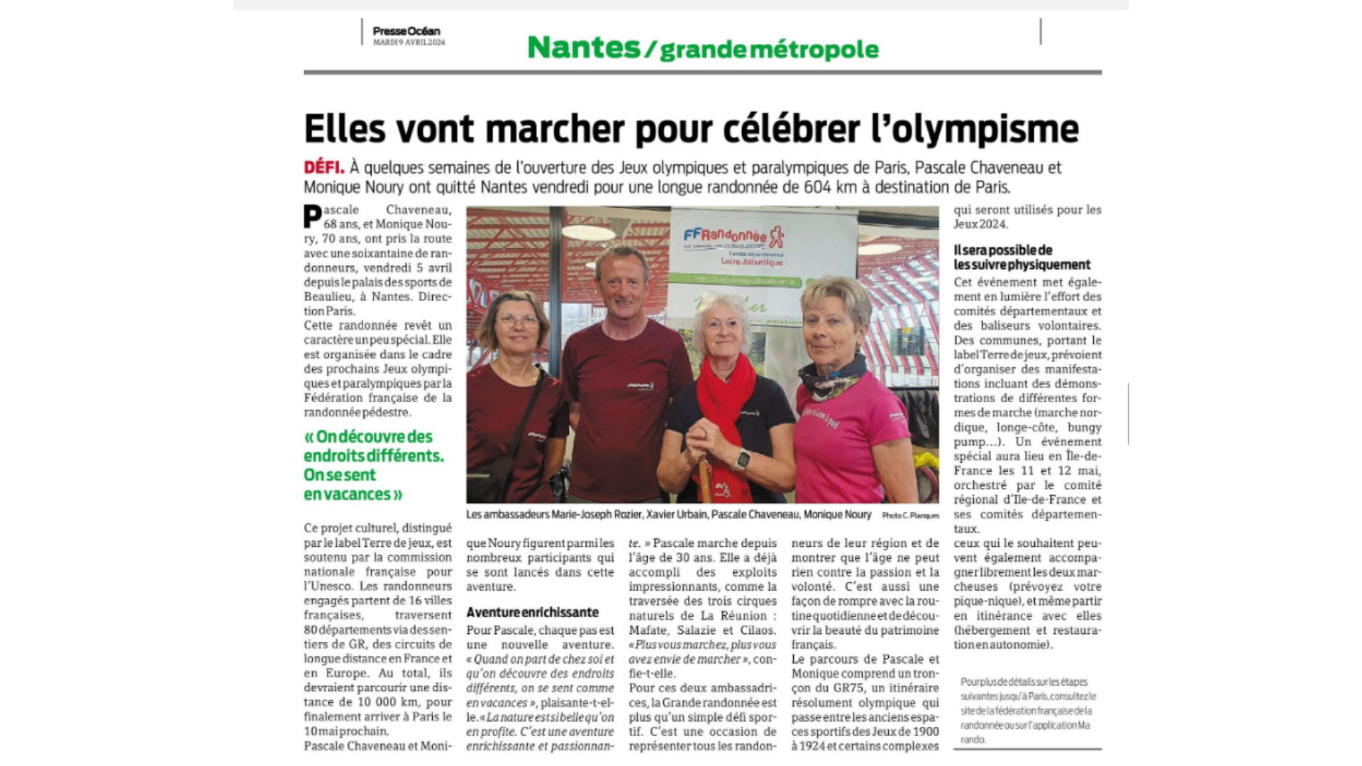 Le parcours de Pascale et Monique comprend un tronçon du GR75, un itinéraire résolument olympique qui passe entre les anciens espaces sportifs des Jeux de 1900 à 1924 et certains complexes qui seront utilisés pour les Jeux 2024. Cet événement met en lumière l’effort des comités départementaux et des baliseurs volontaires. Des communes, portant le label Terre de jeux, prévoient d’organiser des manifestations incluant des démonstrations de différentes formes de marche (marche nordique, longe-côte, Bungy Pump…). Un événement spécial aura lieu en Île-de-France les 11 et 12 mai 2024, orchestré par le comité régional d’Ile-de-France et ses comités départementaux.