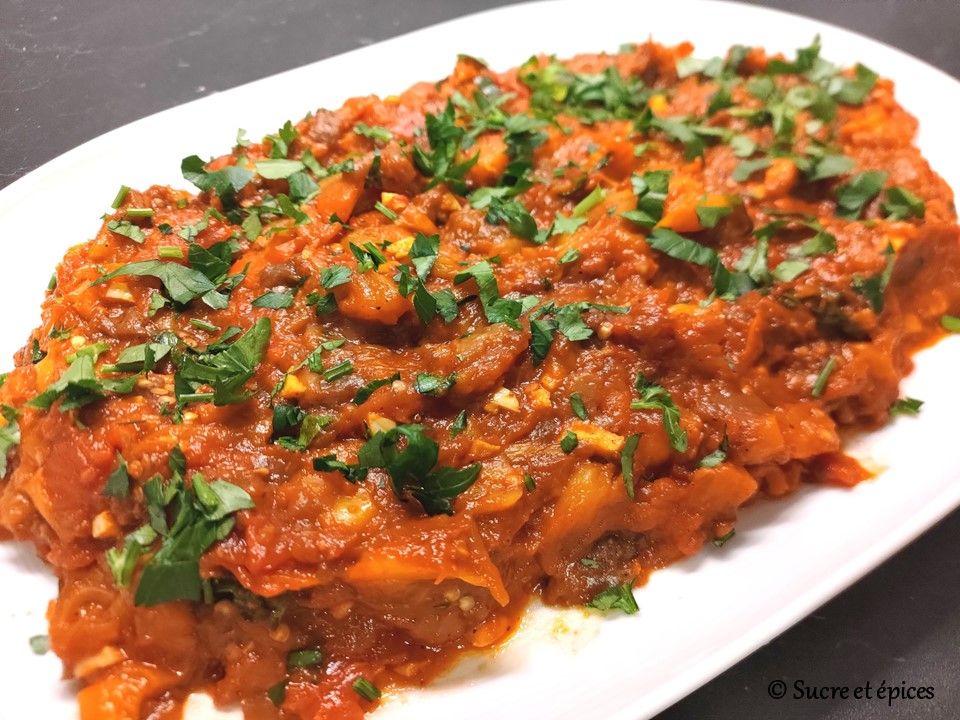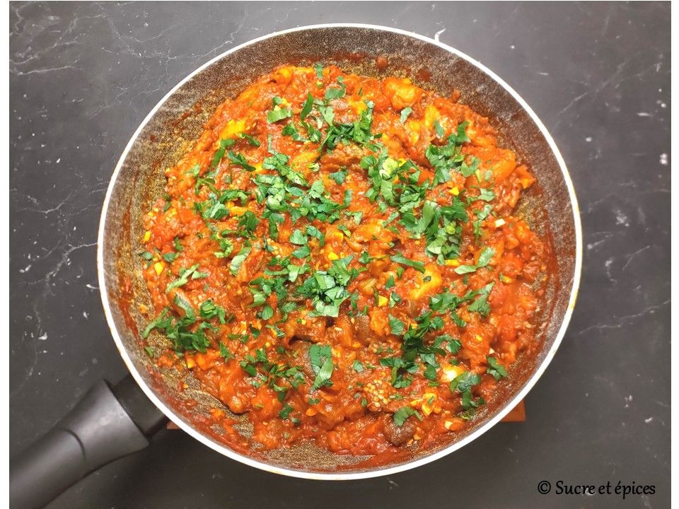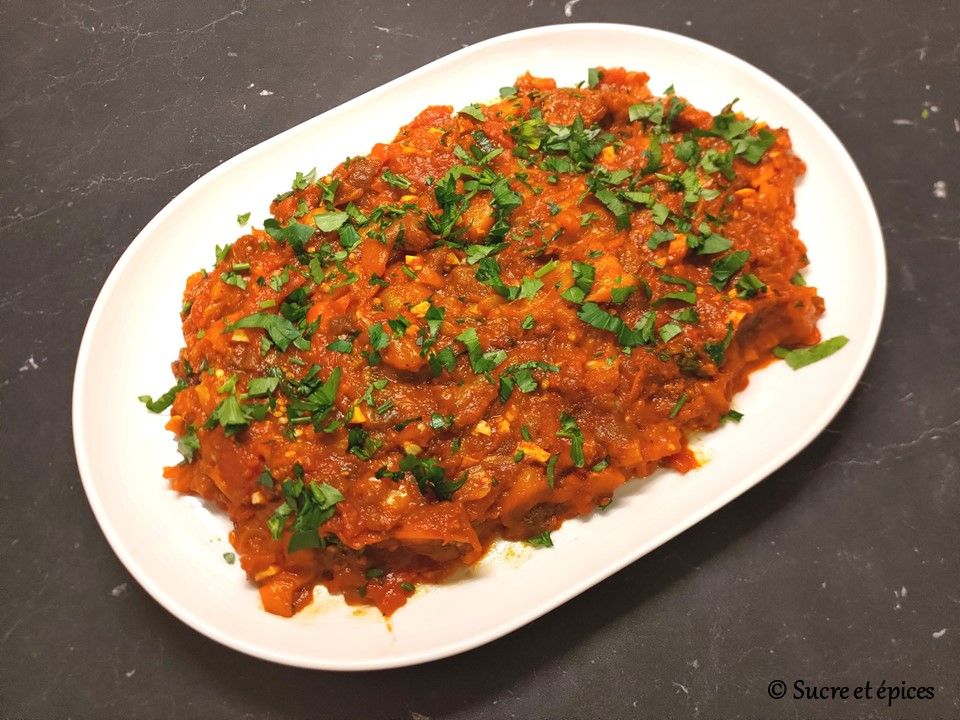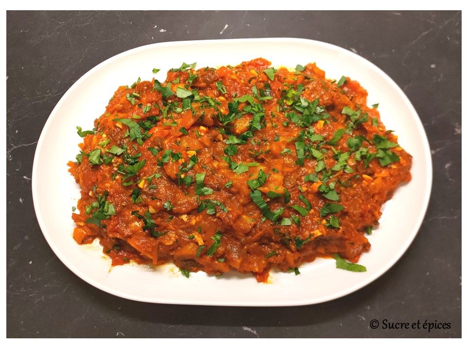 Pour voir la recette avec les photos pas à pas : https://www.sucreetepices.com/2025/09/recette-zaalouk-caviar-d-aubergines-et-de-poivrons-marocain-recette-en-video.html