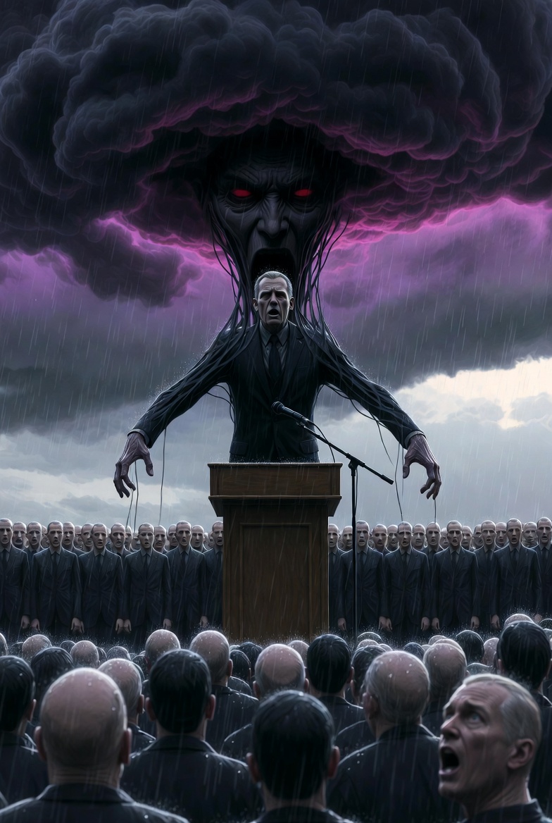 Slavant annonce la pluie devant des milliers de téléspectateurs et un parterre de gens ahuris par tant de malheurs à la fois. Il proclame la création des clones pour les remplacer et la production de mauvaises lumières pour les éclairer le soir venu de leur misère parfaite. Mais surtout il prédit la fin de l’humanité, en concevant des êtres sans âmes prêts à travailler sans relâche pour son enrichissement et celui de ses partenaires de business.