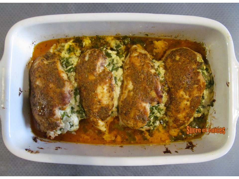 Aujourd'hui je vous propose un plat sain et léger, à base de blancs de poulet. Ils sont fourrés avec une farce composée d'épinards et de fromage frais de chèvre, badigeonnés d'un beurre aromatisé et cuits au four.