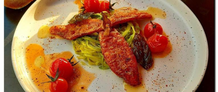 Filets de Rougets poêlés spaghettis de courgettes et huile au citron caviar.