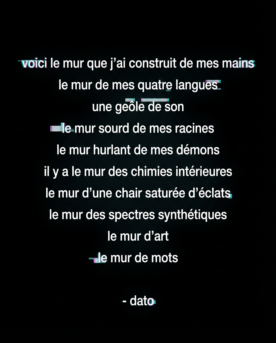 Hier, vers midi, j’étais assis sur une terrasse ensoleillée à Lyon, avec mon café, et le mur est revenu. Il a commencé à se construire pendant mes groupes d’écriture hebdomadaires, au début juste comme un test. Sur cette terrasse, je l’ai senti dans mes cellules, je l’ai vu devant moi, et l’idée m’a collé à la peau toute la journée, puis toute la nuit. Le résultat est cette litanie. Une litanie de "sois" où le "sois" finit purement et simplement écrasé par Le Mur. Vos retours sont les bienvenus.