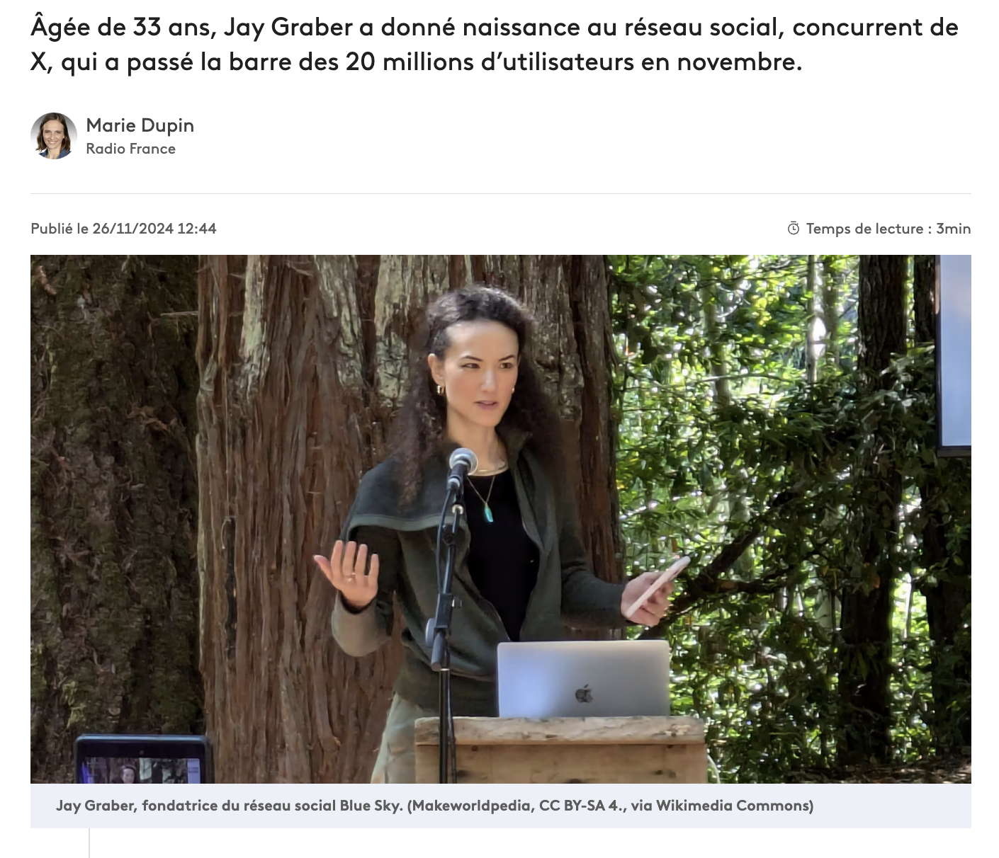 Après avoir écouté et lu une chronique sur France Info consacrée à Blue Sky et à sa fondatrice, j’ai souhaité réagir - sans utiliser de pseudonyme sur France Info et donc en publiant sous mon nom avec mon adresse personnelle prénom.nom@....com en postant un commentaire courtois et bien orthographié sur leur site autour de la chronique : Qui est Jay Graber la patronne du réseau social BlueSky