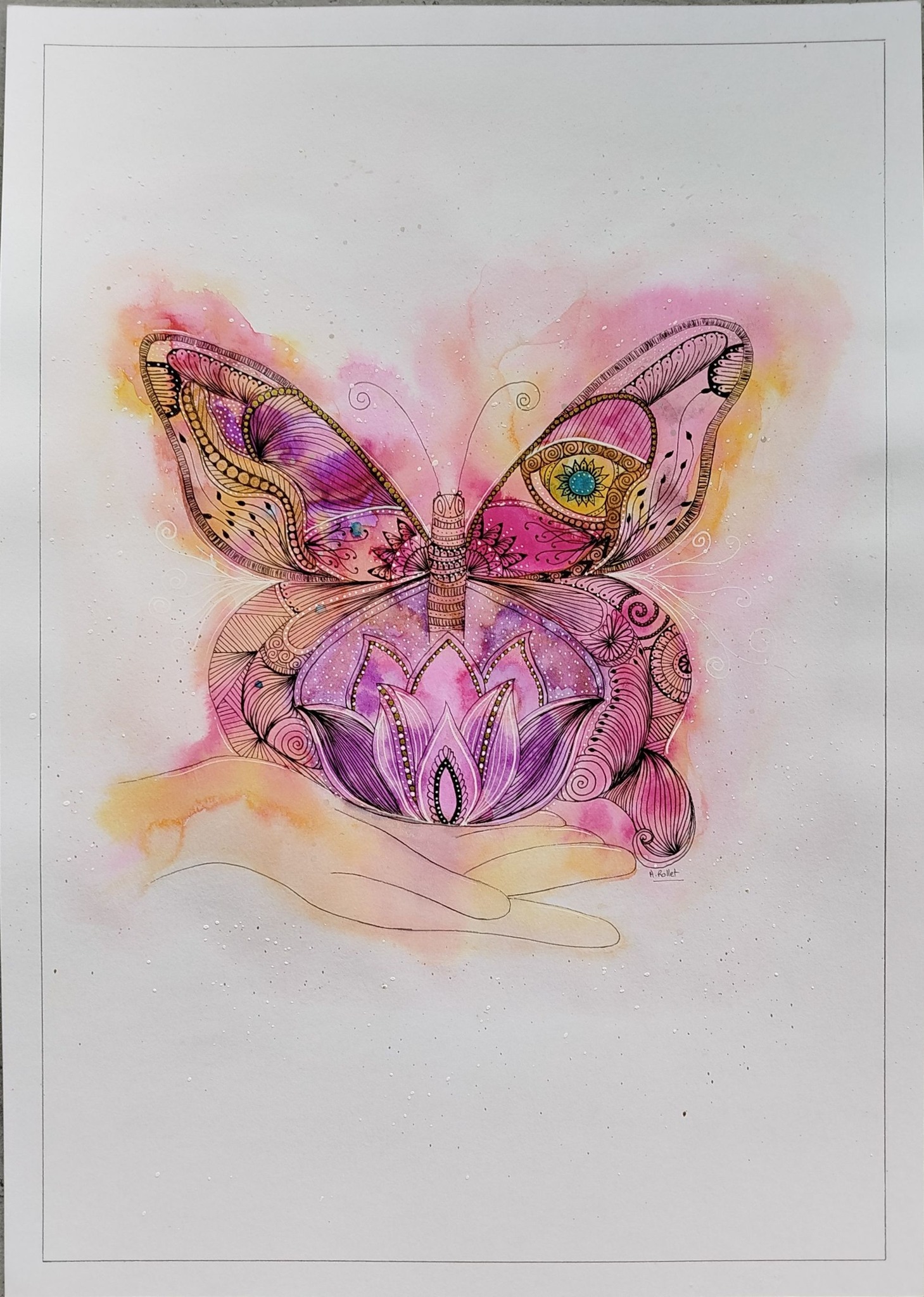 Dans le creux d'une main naît la métamorphose. Le papillon veille sur le lotus du cœur, et l'âme s'ouvre, légère, porté par la lumière.