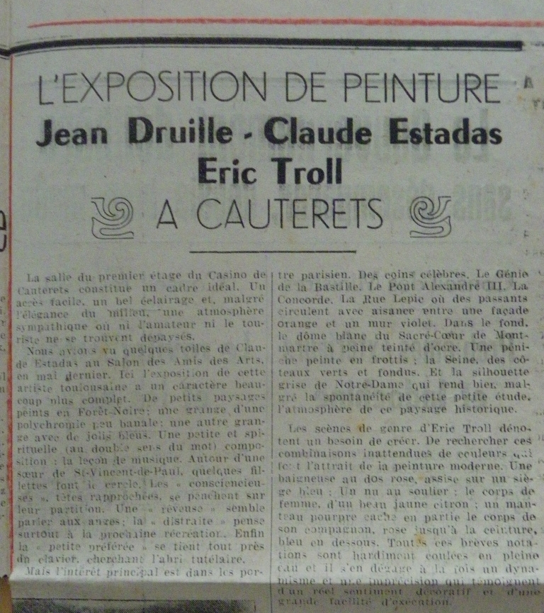 Je défie quiconque de trouver une photo physique de ce Eric Troll, ou même ses coordonnées dans un article de journal, et encore plus un article de critique d’art qui aurait interviewé Eric Troll lors d’un vernissage d’une exposition où il y aurait aussi Jean Druille en personne. J’ai trouvé une coupure de presse d’un tel article qui stipule que Jean Druille expose les œuvres d’Eric Troll qui serait un de ses élèves (photo article La nouvelle république des Pyrénées du 13/8/1948).