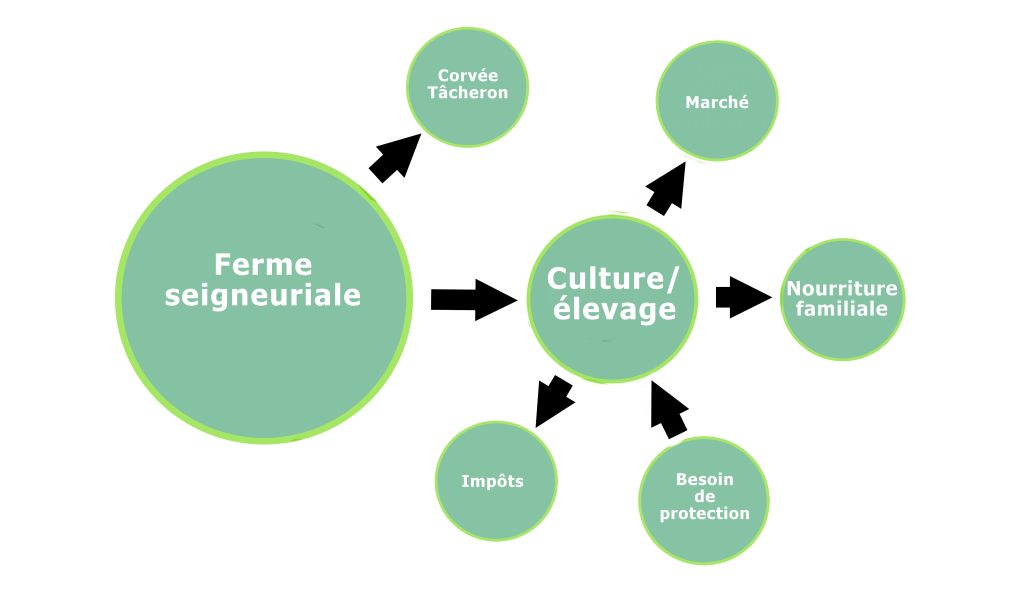Sa production le nourrit lui et sa famille, est vendue partiellement au marché et une partie est prélevée au titre de l’impôt. En échange il bénéficie des avantages que le seigneur peut lui apporter en termes de protection et d’assistance.