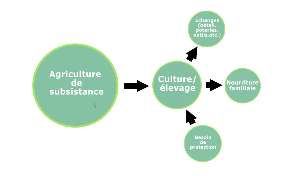 L’agriculture de subsistance au néolithique. Il s’agit de produire pour se nourrir et obtenir d’autres biens. Ce n’est pas encore un paysan, c’est le mode de vie de chacun dans la tribu où tout le monde doit produire des outils, des poteries, chasser, cultiver et participer à la protection du village, des animaux et des cultures. Il n’est évidemment ni question d’impôt, ni d’employé ni quoi que ce soit, c’est le mode de vie basique. On est installé dans une société grégaire dans laquelle chacun échange avec les autres sa production avec une entraide mutuelle pour la défense comme le travail.