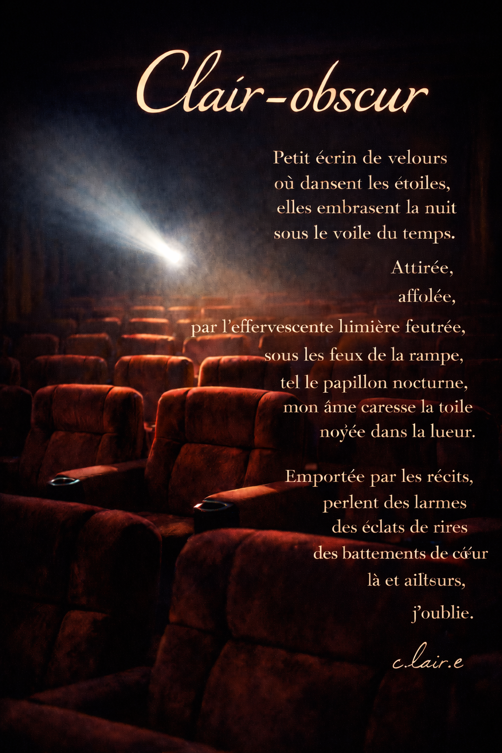Des fauteuils en velours dans la pénombre, éclairés par une lueur projetée venant du fond de la salle.