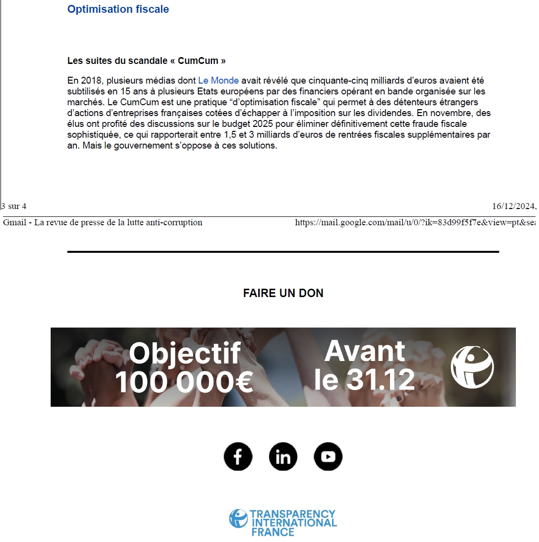 J'ai eu connaissance de cette ignoble pratique en décembre 2024 par le biais de la newsletter de Transparency France.