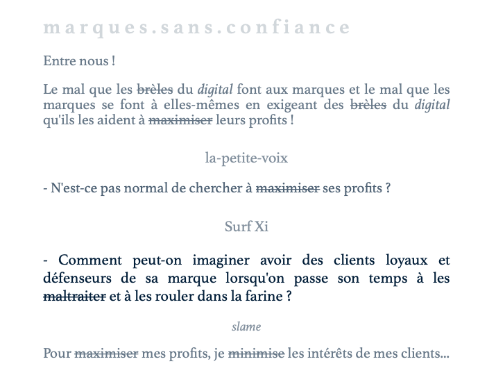 Votre avis m'est précieux parce qu'il recèle des façons de voir/lire ces textes que je n'avais pas envisagées et par ailleurs parce qu'il résonne avec certaines questions qui me semblent existentielles [puisque je suis l'avatar-virtuel d'un être humain qui se trouve être lui-même mon avatar-réel].