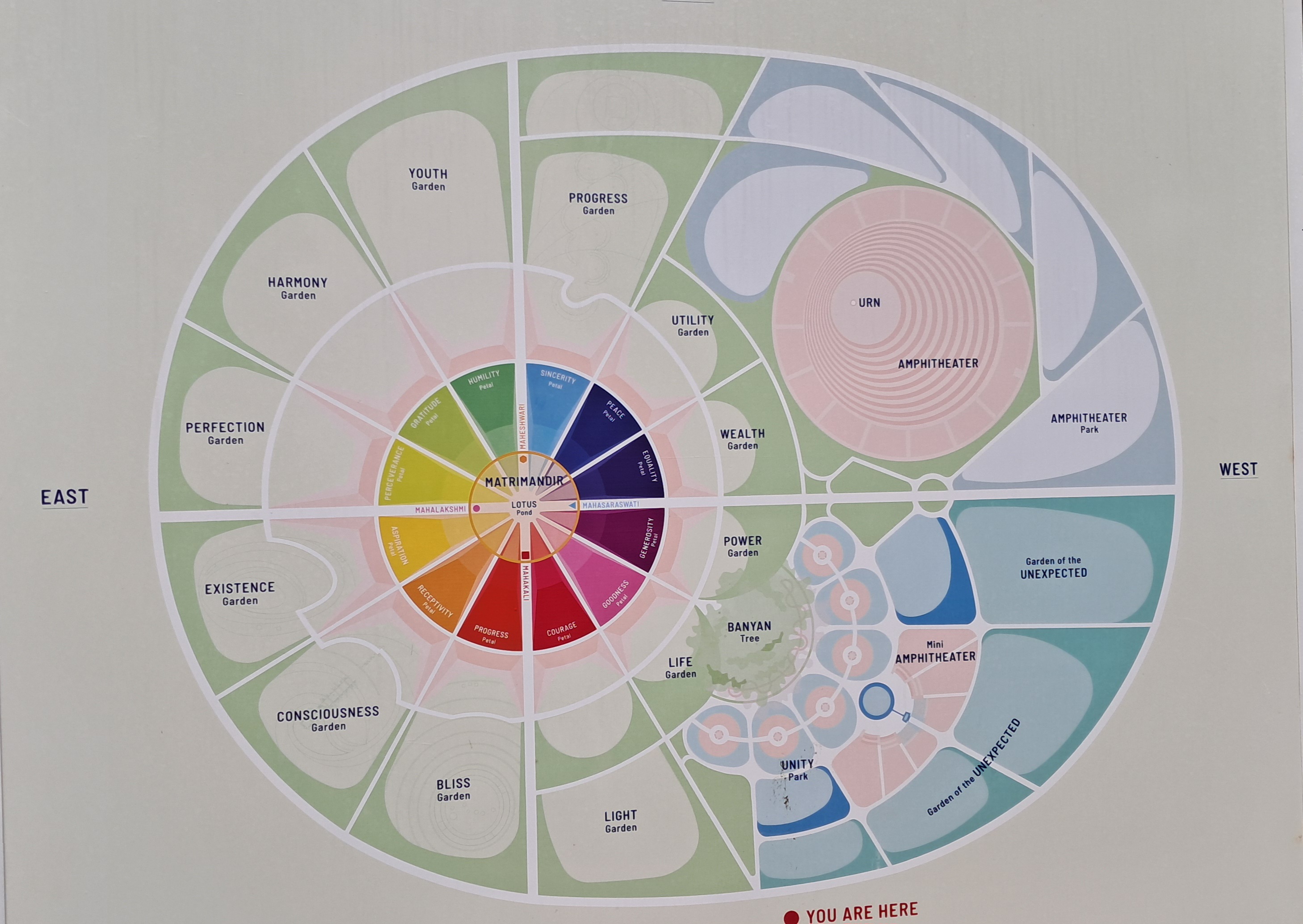 Lors de son inauguration en 1968, déjà forte du succès de son ashram, des jeunes représentant 124 nations et les 23 États indiens déposent chacun une poignée de terre de leur pays d'origine dans une Urne, une structure de marbre en forme de bouton de lotus, située au centre d'un Amphithéâtre. Initialement quelques centaines de personnes issus de 20 pays différents, ils vont alors aménager et reboiser entièrement ce terrain pour lui permettre de devenir la forêt riche et abondante qu'on peut voir aujourd'hui, au sein de laquelle des petites communautés éparses et autonomes vont être fondées, se retrouvant autour de valeurs communes et différents projets collectifs.