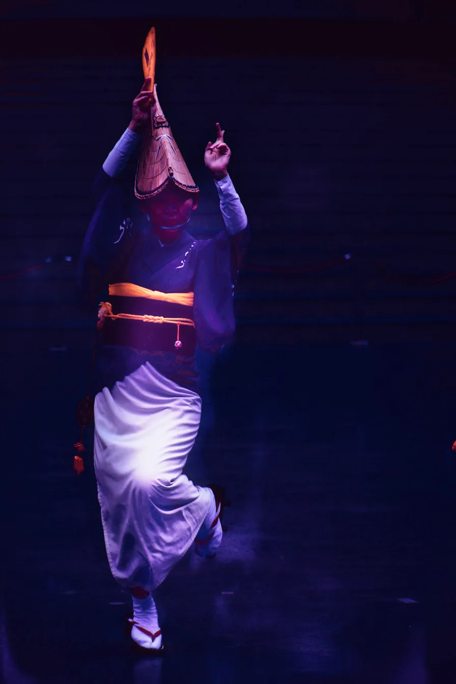 C'est le contraire du portrait intime de la première photo. C'est l'Awaodori de nuit, la danse « folle », celle dont vous écriviez qu'elle bascule dans une autre dimension quand le soleil disparaît. La danseuse n'est plus une jeune femme que l'on observe à travers un chapeau de paille. Elle est devenue une figure. Une flamme dans le bleu. Ce que Kawabata appelait la beauté quand elle cesse d'appartenir à quelqu'un pour devenir un pur événement du regard.