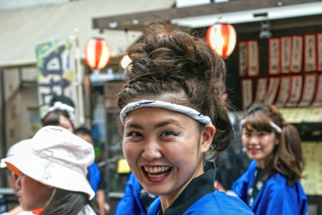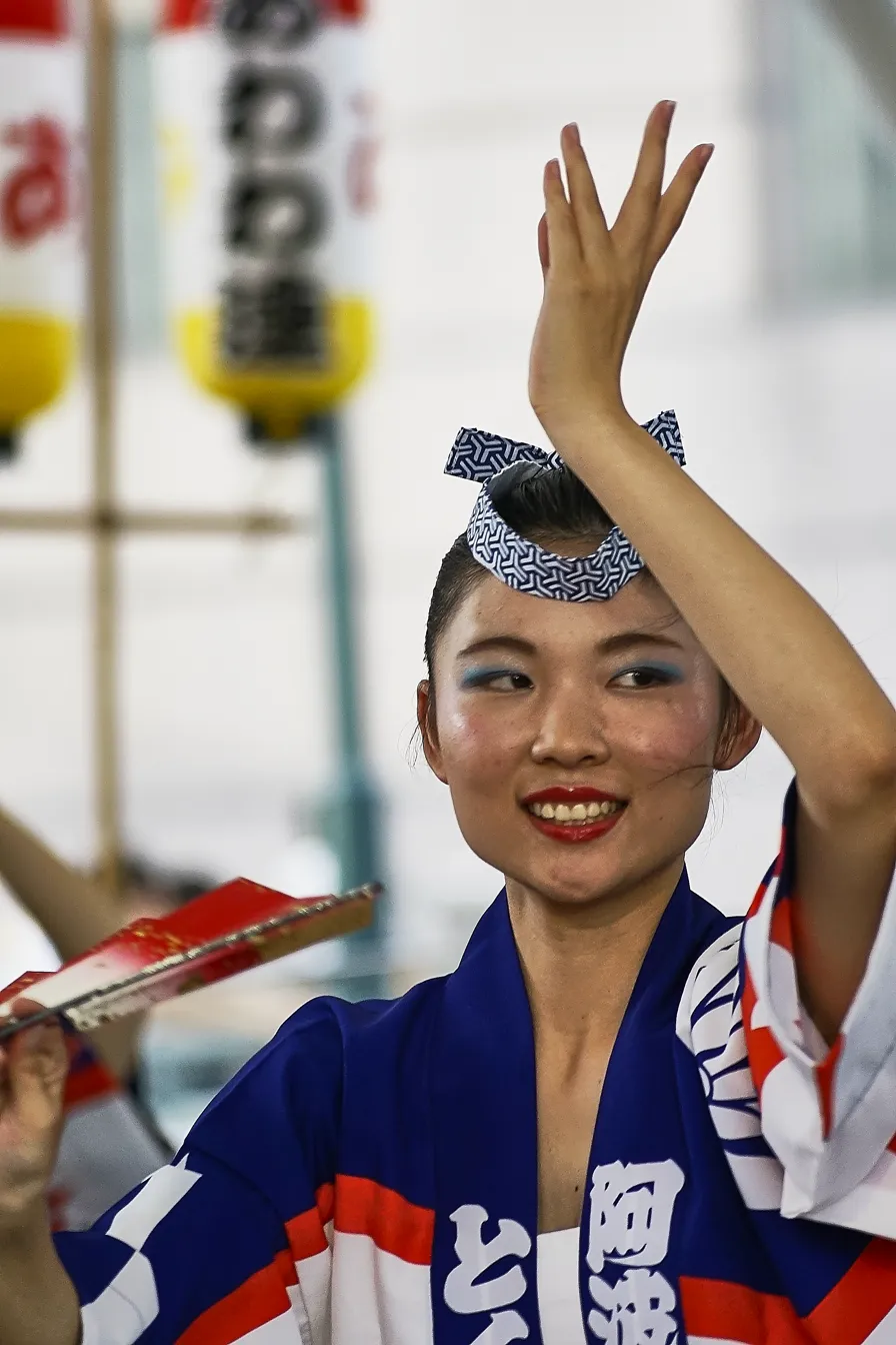 Ce n'est plus le sourire de la danse — ce sourire dirigé, composé, porté vers le public. C'est le rire de la rue. Le rire nu. Le rire d'une jeune femme en sueur, les cheveux remontés en chignon sauvage, des mèches collées aux tempes, le maquillage qui commence à couler — et qui s'en fiche. Qui rit parce qu'un étranger avec un gros appareil la regarde comme si elle était la huitième merveille du monde. Qui rit parce qu'elle vient de danser et que la danse l'a rendue invincible. Qui rit parce que c'est août et que c'est Tokushima et que c'est la nuit des fous.