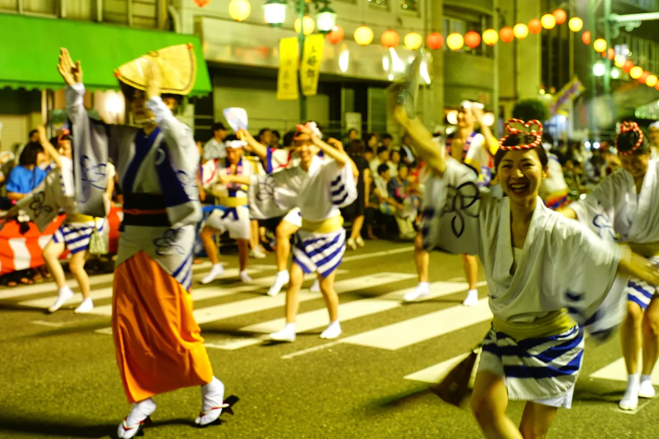 C'est la nuit. Les lanternes rouges et oranges sont allumées, tendues en guirlandes au-dessus de la rue comme un chapelet de petites lunes. L'asphalte brille — de chaleur, d'humidité, de cette lumière jaune et verte des néons de Tokushima qui donne à tout l'Awaodori nocturne sa couleur irréelle, cette teinte de rêve éveillé, de fièvre heureuse.