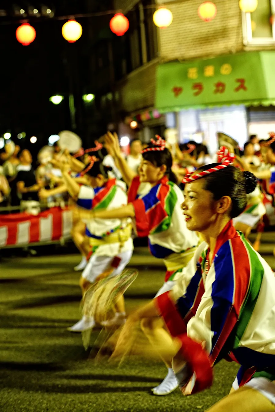 Et les couleurs. Ce ren a choisi des happi à bandes diagonales — bleu, vert, rouge, sur fond blanc — qui dans la lumière des lanternes deviennent presque psychédéliques. Derrière, la guirlande de lampions rouges et oranges troue la nuit comme une phrase de musique. L'enseigne verte d'un commerce — マラカス, Marakasu — luit dans l'angle du cadre, rappel trivial et tendre que cette danse sacrée a lieu dans une rue commerçante ordinaire, entre un fleuriste et un bar.