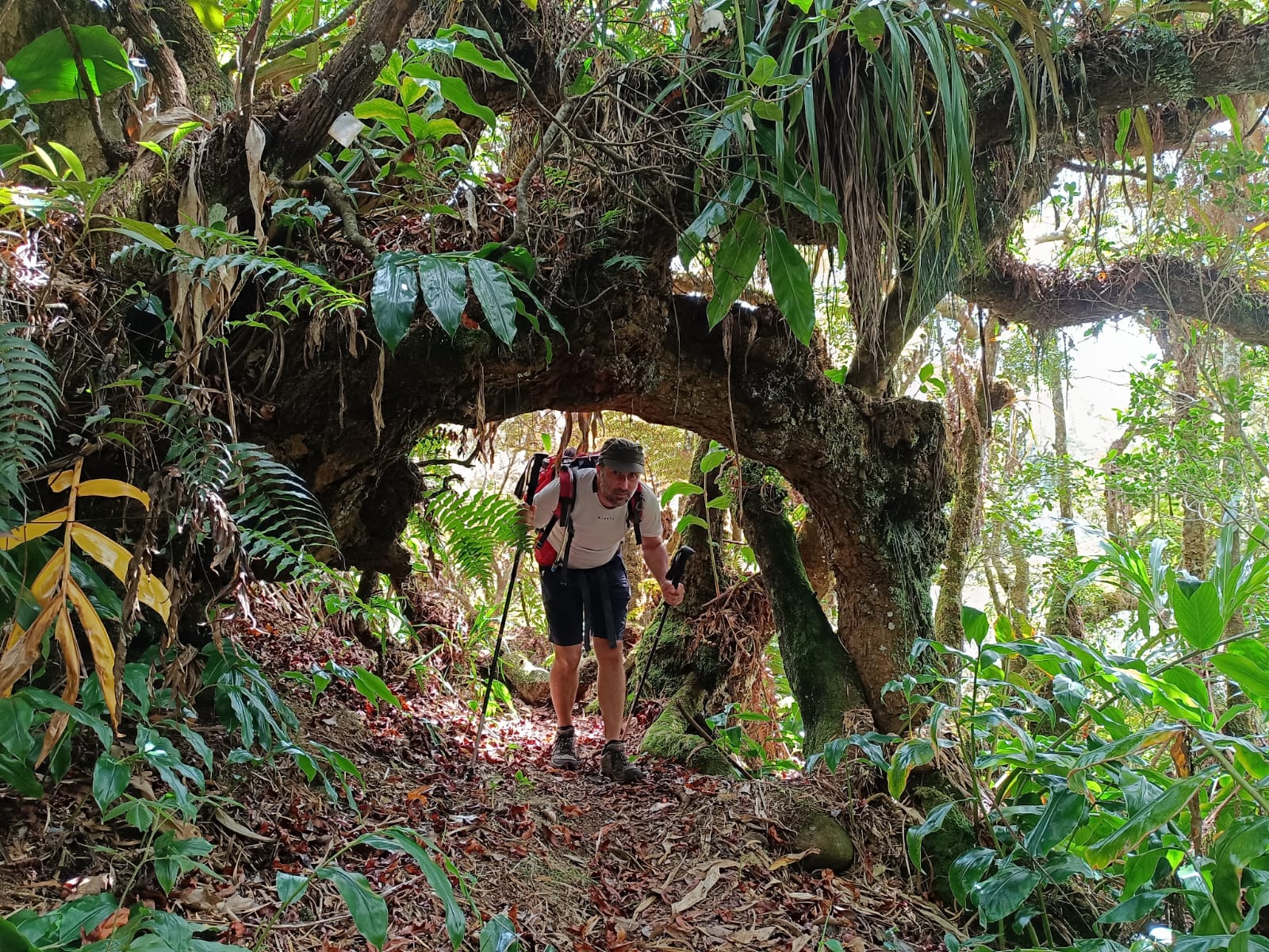 Le Maïdo : après les champs de mimosas et une sorte de garrigue/maquis composé de petits plantes très odorantes aux accents de thym, les arbustes prennent de l'ampleur et accrochent ces mousses qui leur donnent un aspect de forêt poilue ou chevelue