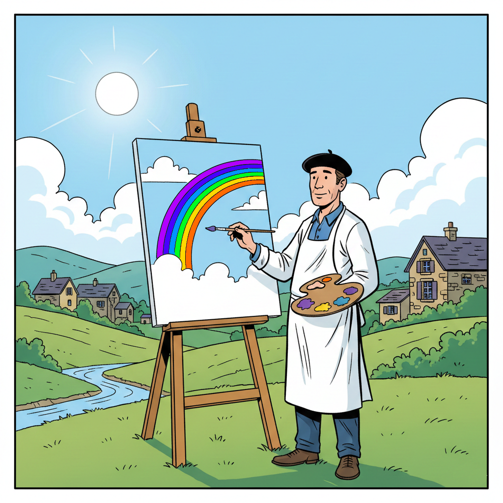 Violet, indigo, bleu, vert, jaune, orange… Et flûte et zut ! J’ai encore oublié de racheter un tube de couleur. Je ne vais pas pouvoir livrer ce tableau promis à mon galeriste. Il va se fâcher tout écarlate, comme une tomate, et me lancer : “Tu as toujours une bonne excuse”.