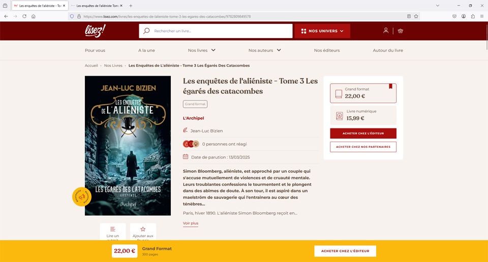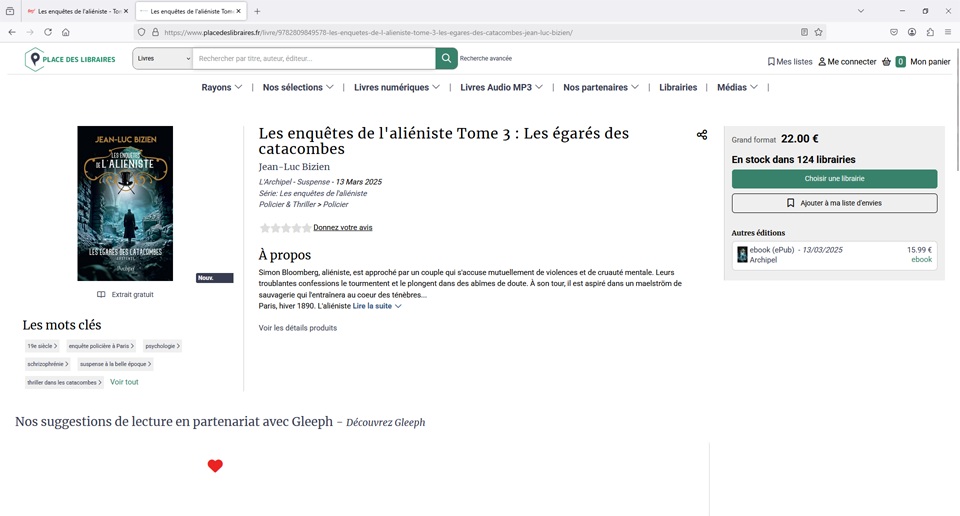 2) Recherche : Allez sur https://www.placedeslibraires.fr/ et cherchez ces romans. Vérifiez bien que sa date de sortie est antérieure à la date actuelle, mais plus récente que trois mois.
