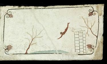 Constance le suivit à l’intérieur de la chambre mortuaire. Une torche éclairait la pièce et l’on pouvait découvrir une magnifique peinture murale représentant une rivière, un arbre dénudé et un plongeur sautant du haut d’une colonne. Constance était émerveillée. Le sol était jonché d’une dizaine de petites coupelles en terre cuite contenant chacune une couleur. Et à côté, une jarre d’huile. Elle regarda Pythodôros, pleine d’admiration et s’adressa à lui.