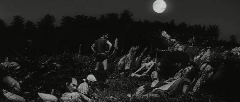 Le film commence par l'apparition à l'écran de Matashishi et Tahei, deux paysans en terre ennemie dont le retour au pays est empêché plus par une frontière intérieure qu’une frontière extérieure. En effet, ayant vendu leurs maisons pour acheter des armures, convoitant un prestige social comme soldats, les malheureux arrivent trop tard sur le lieu du conflit et les voilà déjà vaincus. Une absence de stratège et une volonté défaillante qui va les caractériser tout au long du film jusqu’à la scène finale qui amorce un champ des possibles car ce film est un ensemble de chemins d’expériences auquel est invité également le spectateur à réaliser par l'observation.