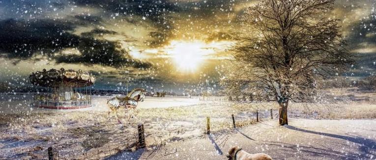 Mais aujourd’hui, ce lugubre décor semble prendre vie. Le vieux canasson semble trotter joyeusement dans la neige fraîche, imité par ses semblables dans le manège derrière lui. Le soleil pale du mois de décembre inonde d’une lumière jaune ce paysage blanc et paisible. Même Ruffus, mon chien fou, n’ose bouger.