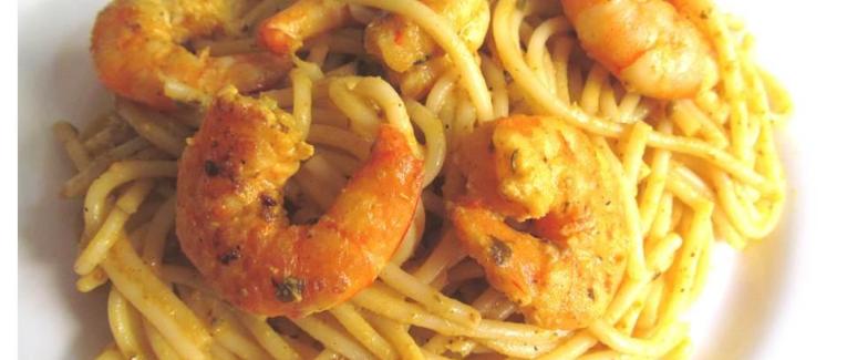 Spaghetti aux crevettes, sauce au yaourt et épices