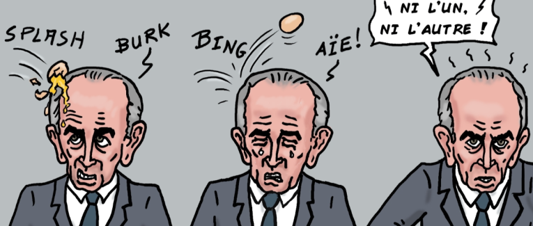Décidément, Eric Zemmour, le Président du parti d'extrême droite reconquête, attire les oeufs ! En effet, le 12 mars 2022 à Moissac dans le Tarn-et -Garonne, un homme lui écrase unoeuf frais sur la tête, et le 4 mai dernier à Ajaccio en Corse, c'est une femme qui lui lance de oeufs !!! Bref, oeufs frais ou oeufs durs, qu'est-ce qui est le moins pire ???