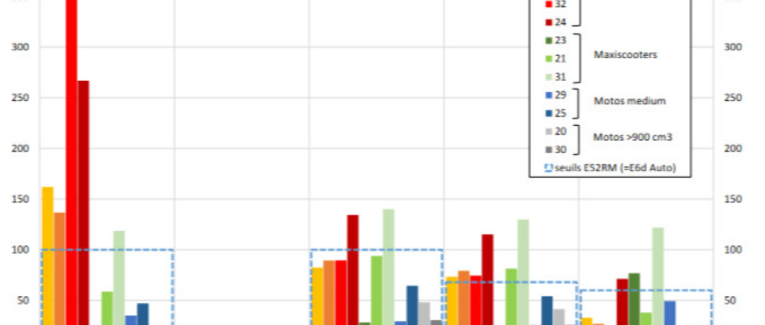 (L’étude démontre selon d’ADEME en dehors des 125 cm² sur voie rapide que les émissions émises des gaz d’échappement d’un deux-roues motorisé neuf est tout à fait conforme aux normes de l’UE et sont exactement les mêmes normes que ceux des véhicules à quatre roues).