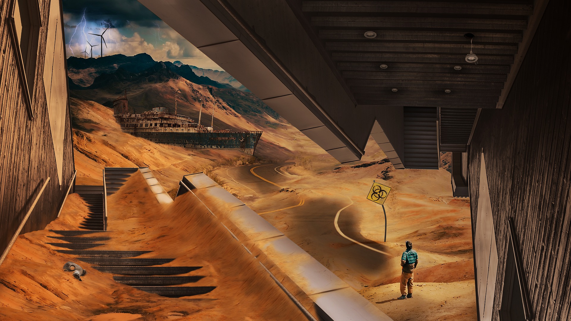 J’ai besoin de souffler. De respirer. De m’éloigner de tout ce vacarme incessant, de ce chaos irrespirable. Alors je me suis porté volontaire pour une nouvelle ronde, une fois de plus. Je préfère passer encore une nuit blanche à marcher sans but sous un ciel menaçant que de rester enfermé ici-bas. Remonter en surface est la seule façon, pour moi, de respirer. Ce qui est plutôt ironique, puisque l’air est si toxique que je ne peux pas me déplacer sans un attirail high-tech sur le nez. Mais ce paysage a un goût de liberté. Est-ce à cause du sable qui réinvestit les lieux un peu plus chaque jour ? Est-ce l’improbabilité du décor ? Ou tout simplement ce calme surprenant ?