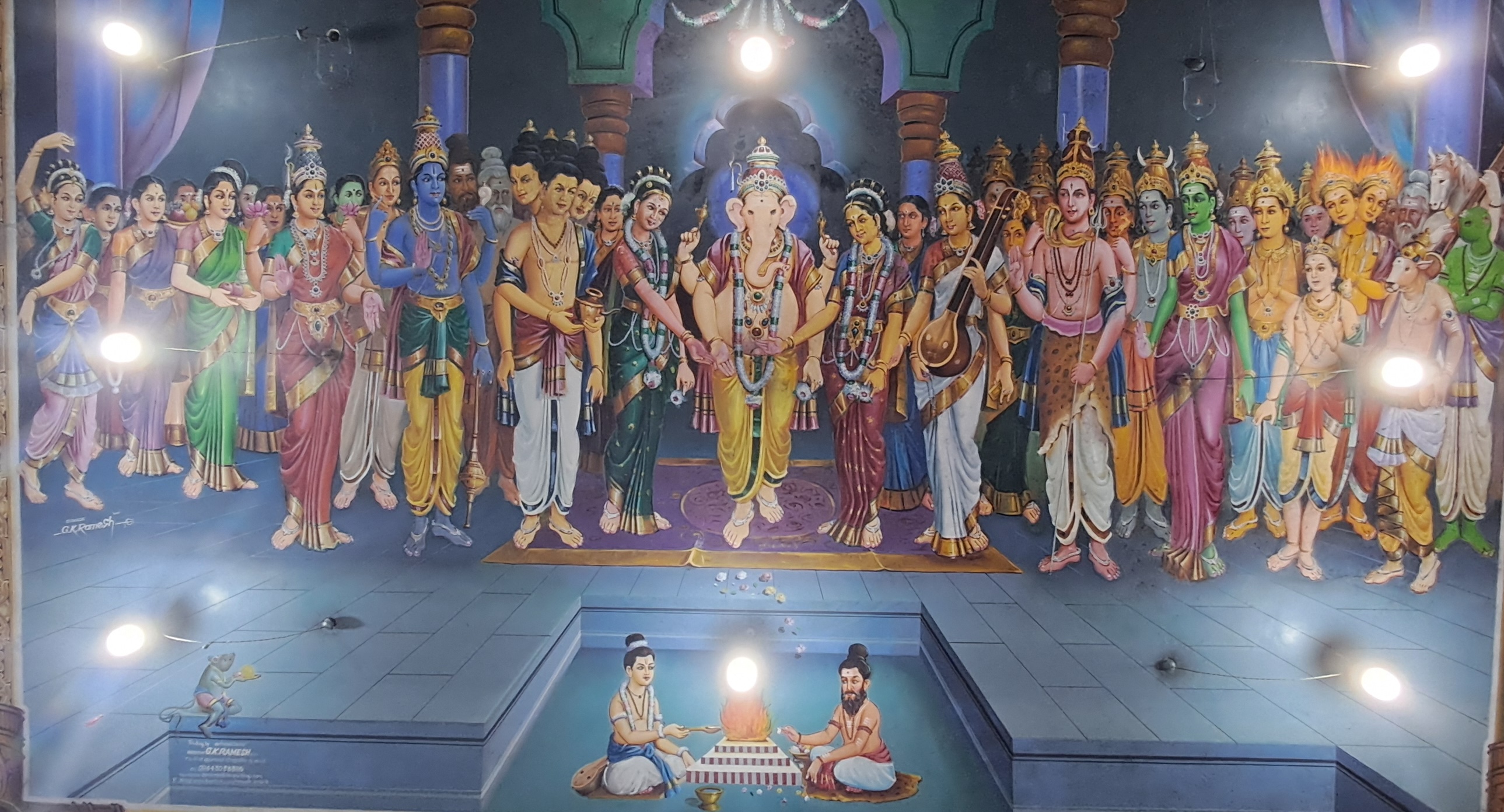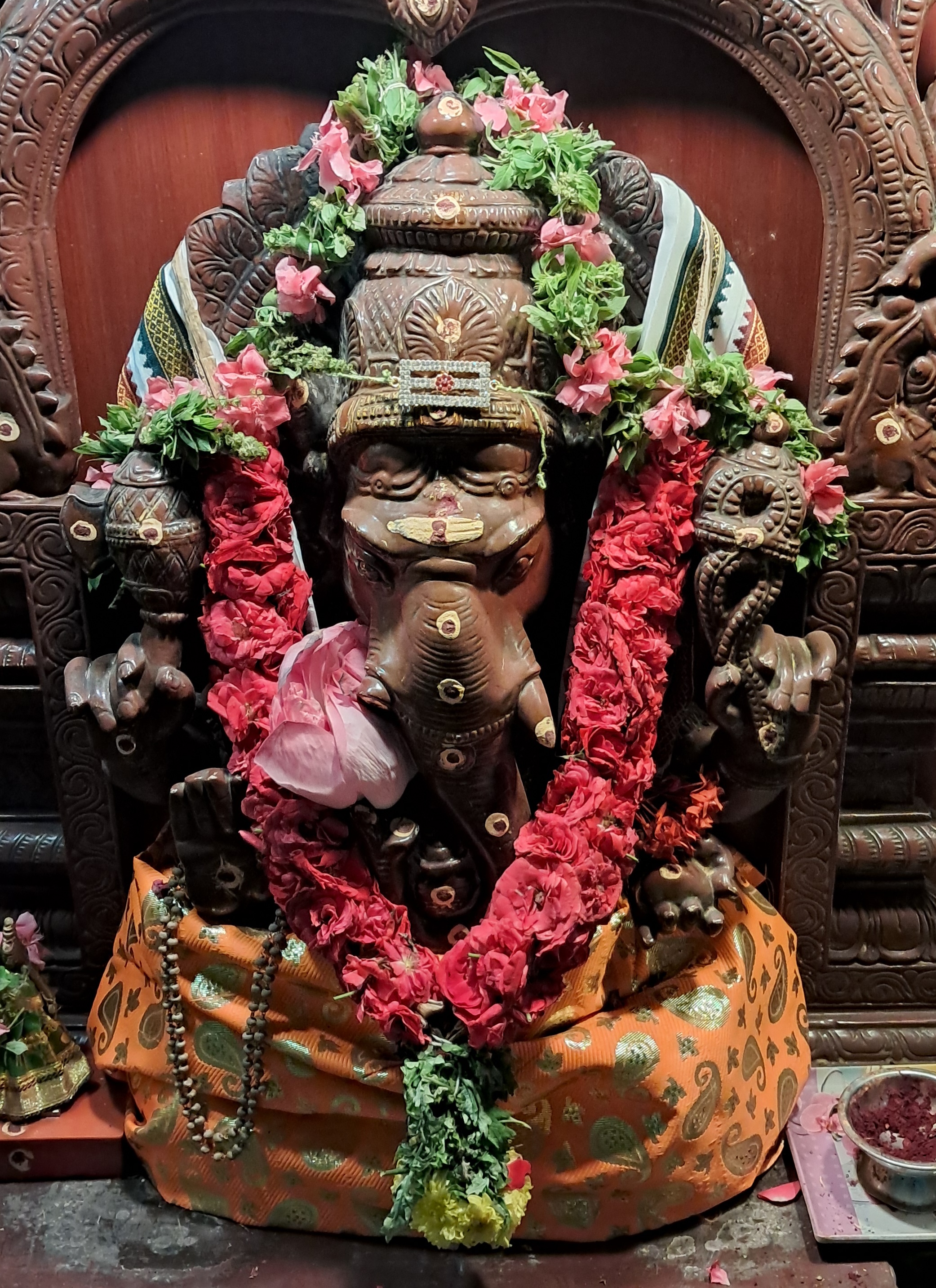 - Ganesh, ou Ganapati, le dieu à tête d'éléphant, 2eme fils de Shiva et Parvati, porteur d'une défense cassée, d'une hache, d'un nœud coulant, du Ohm et du Swastika la croix gammée.